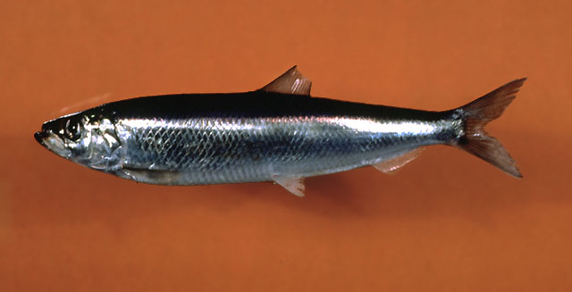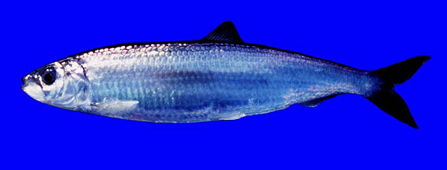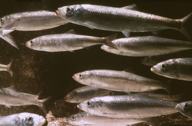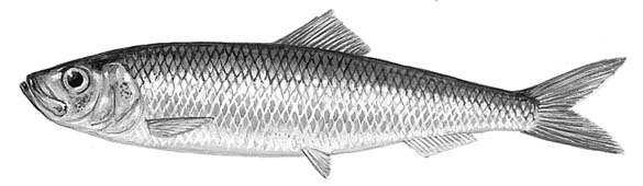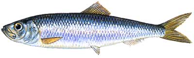 Unter Wasser fasziniert das Farbspiel des Herings: Der Rücken leuchtet in allen Farben von gelbgrün über blauschwarz bis blaugrün mit einem dezenten Purpurschimmer. Der Bauch ist weiß, die Flanken glänzen silbrig "Silber des Meeres" werden Heringsschwärme auch genannt. Als gefangener Fisch sieht er jedoch eher unscheinbar grünblau aus. Er hat glatte Kiemendeckel, Schuppen ohne Dornen, der Unterkiefer ist länger als der Oberkiefer. Die Bauchflosse des Herings sitzt hinter dem vorderen Ende der Rückenflosse. | ||
